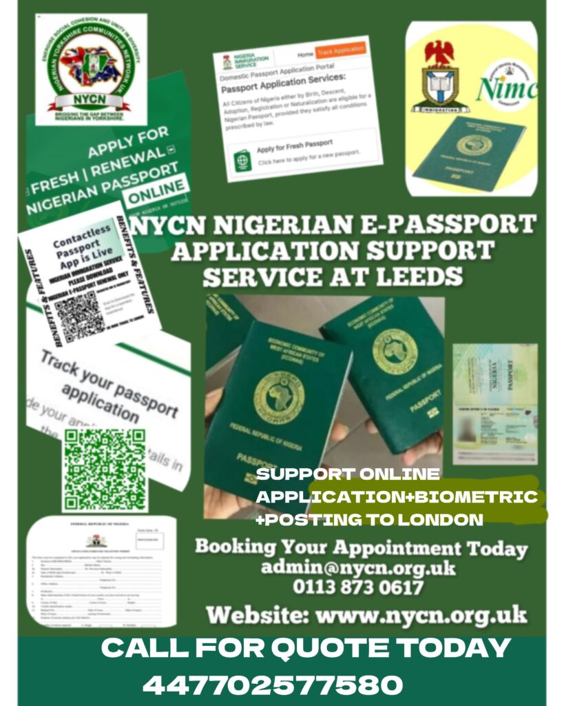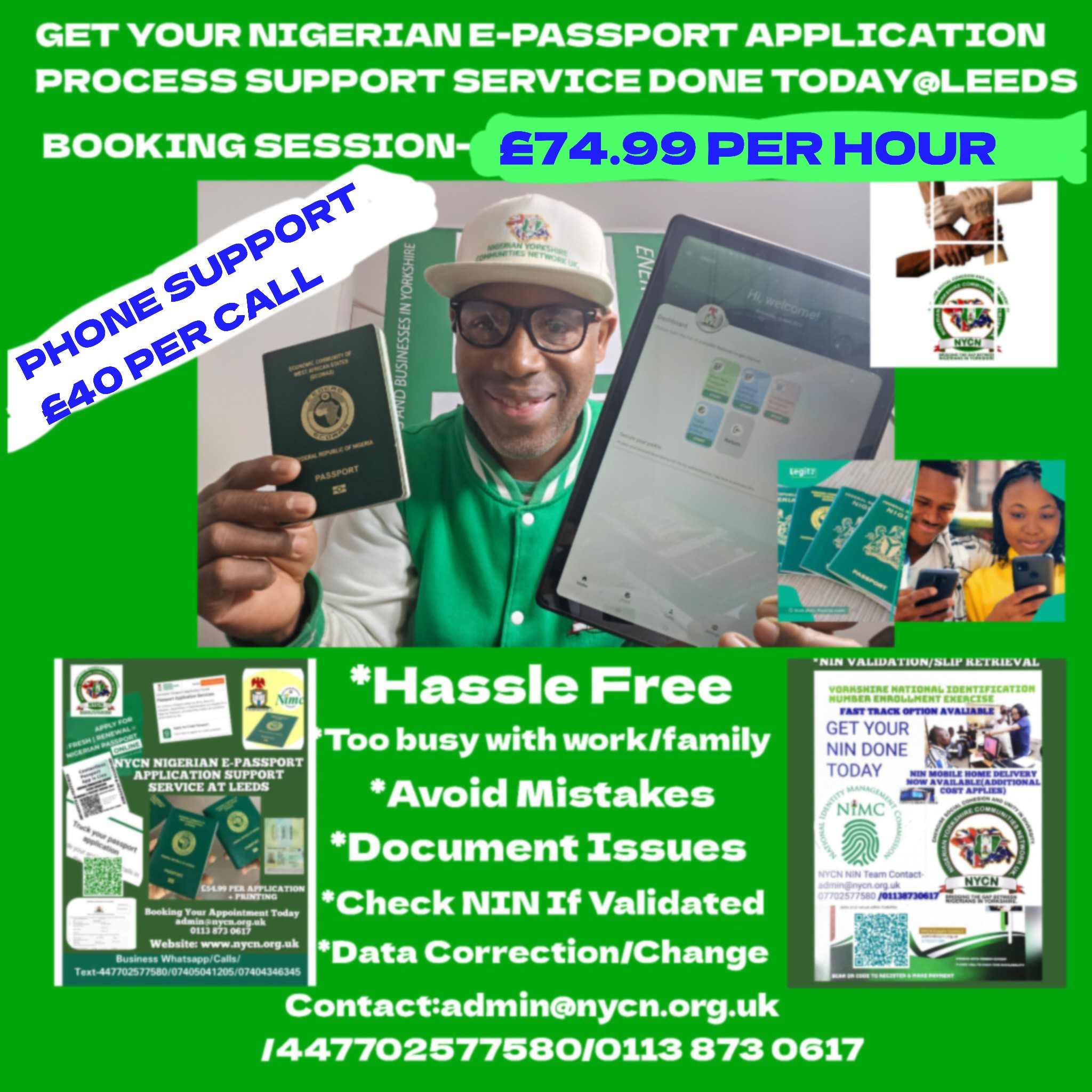 The Nigerian Yorkshire Communities Network UK CIC would like to introduce the Nigeria E-Passport Application Support Service for the benefit of Nigerians within the Leeds & Yorkshire Region/UK; registration is now opened to all for bookings but our service will commence November 2024, we think this service will support Nigerians alongside our current ongoing NIN(National Identification Number)enrollment service at our community center in Armley,Leeds, Families who are wanting to apply for their fresh/ to renew Nigerian E-Passport for long but unable to do so due to lack of time such as work,family and business daily commitments. Our organisation cannot produce or renew a Nigerian E-Passport in Leeds but this support service is to carry out on behalf of the applicant all the online application processes with instructions & supporting documents by working with the applicant.Our goal is to complete the Nigerian E-Passport Application Process for the applicant, get the applicant application reference number and ID,book the next available bio-metric appointment for the applicant, and with/without to print the copy of the application form,acknowledgement receipt and appointment slips ready for the applicant’s appointment at the Nigeria High Commission,London.